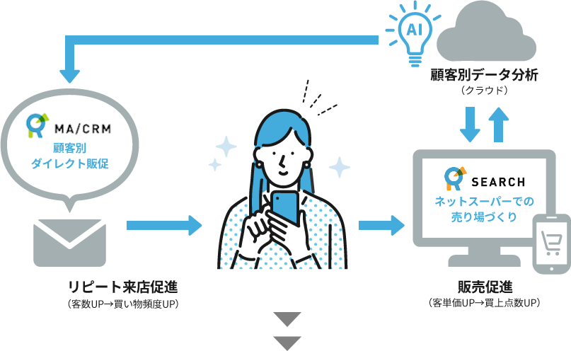商品を並べているだけ、便利に効率的な買い物ができるだけでなく、実際のお店と同じように「おすすめ品がすぐにわかる」「新商品との出会いがある」「フレンドリーな接客がある」そして最後に「楽しい買い物だったな。また来よう」と感じてもらえる「買い物体験」が重要です。